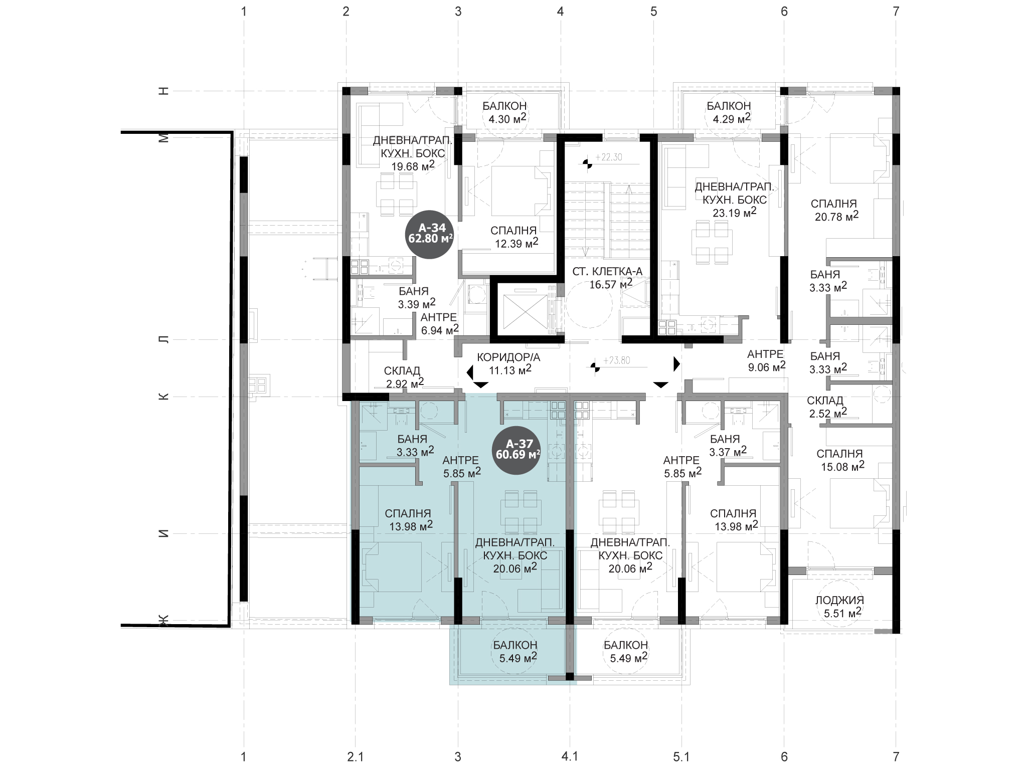 | Апартамент А37 | Етаж 9 | Двустаен | 60.69 | 72.05 | ЮЗ | Свободен |