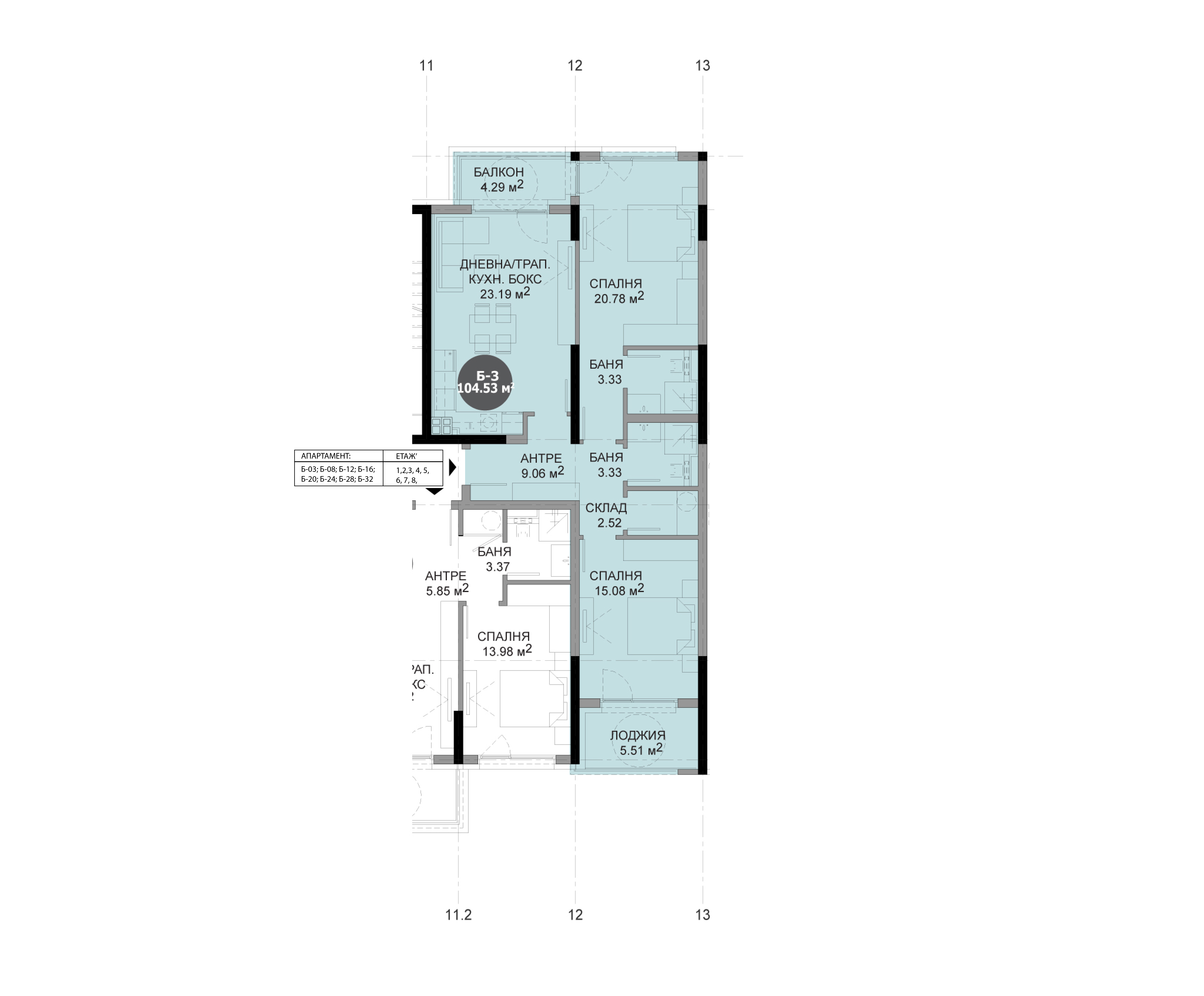 | Апартамент Б32 | Етаж 9 | Тристаен | 104.53 | 118.51 | Свободен |