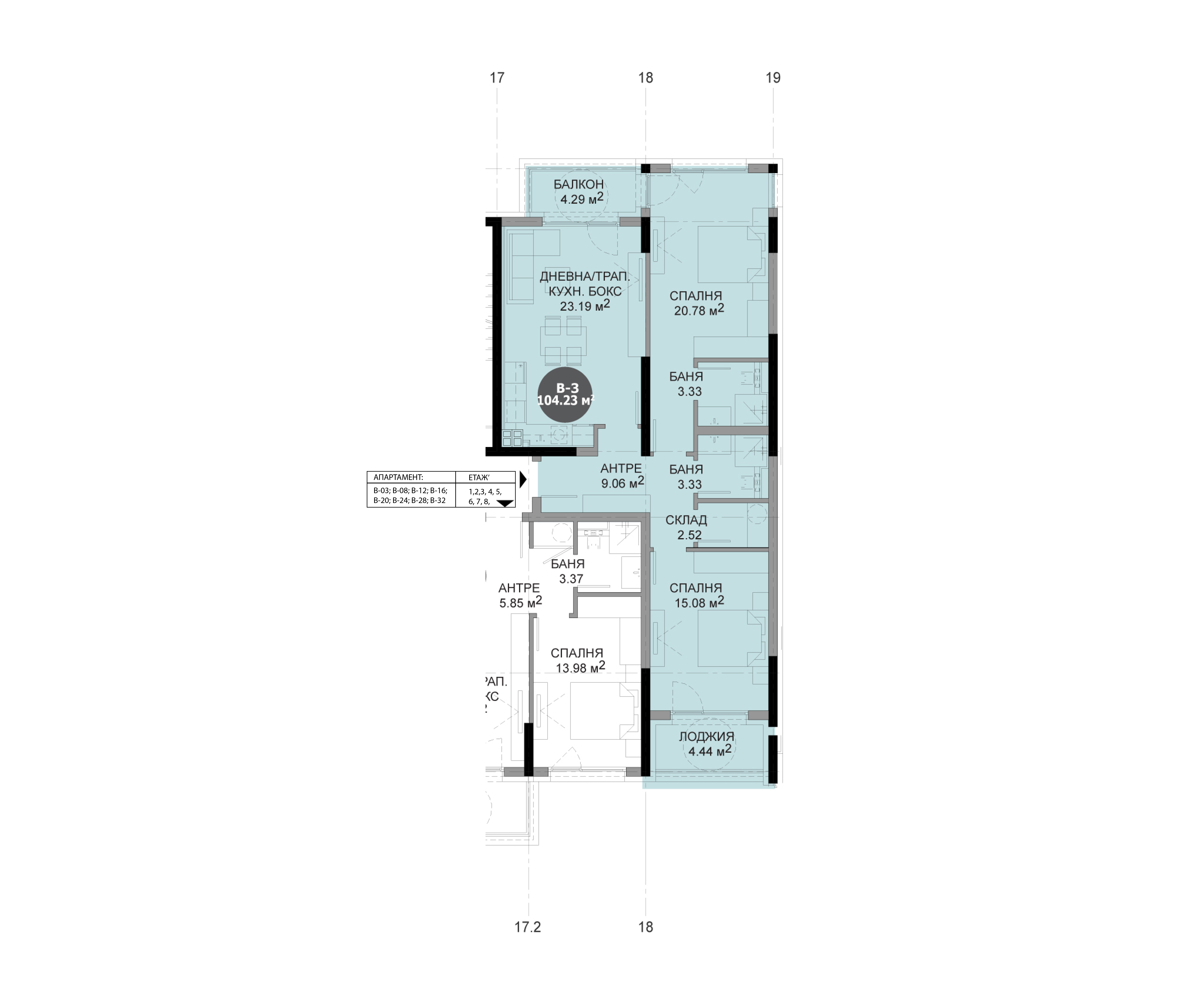 | Апартамент В12 | Етаж 4 | Тристаен | 104.23 | 119.05 | ЮЗ/СИ | Свободен |