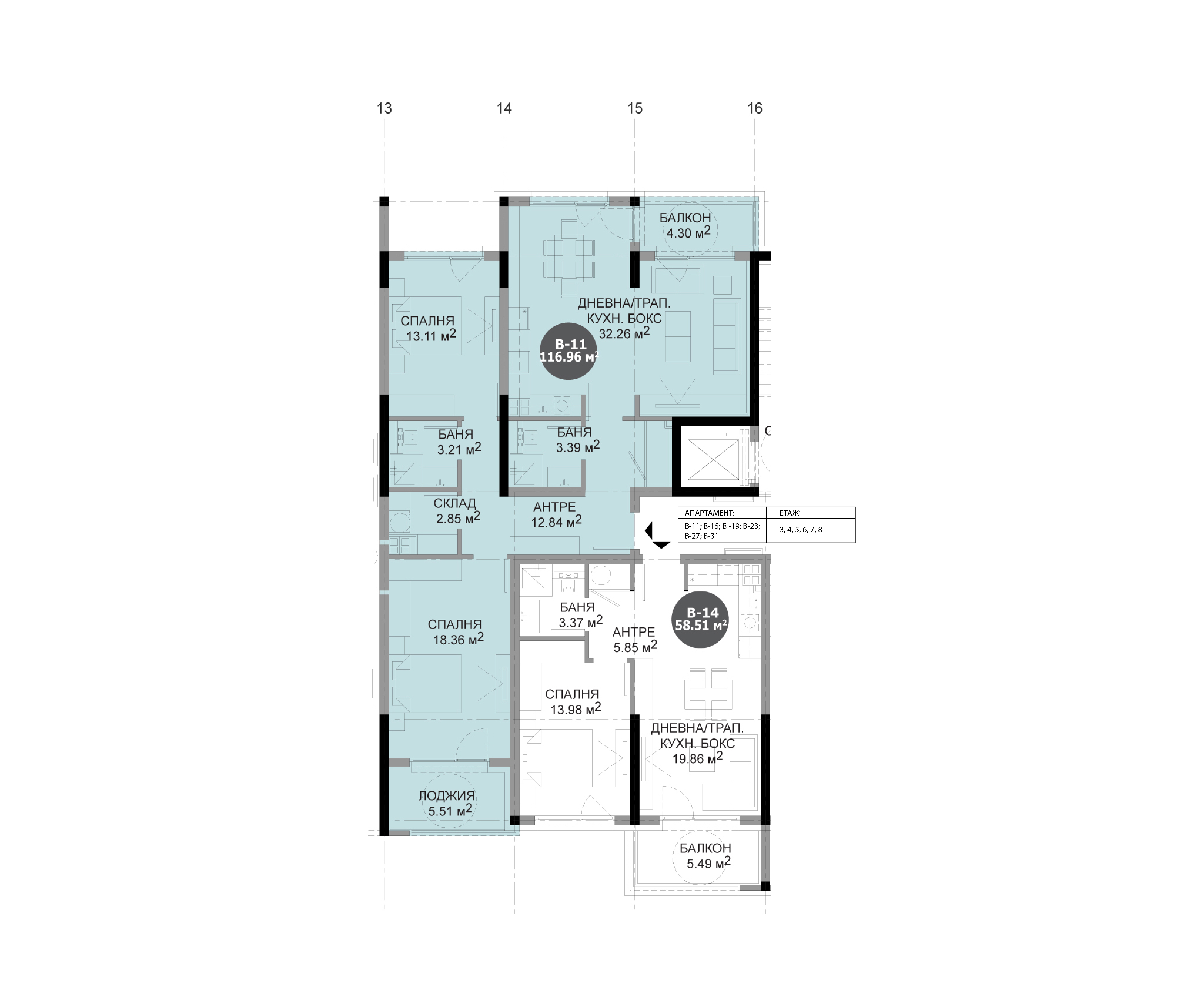 | Апартамент В23 | Етаж 7 | Тристаен | 116.96 | 133.87 | ЮЗ/СИ | Свободен |